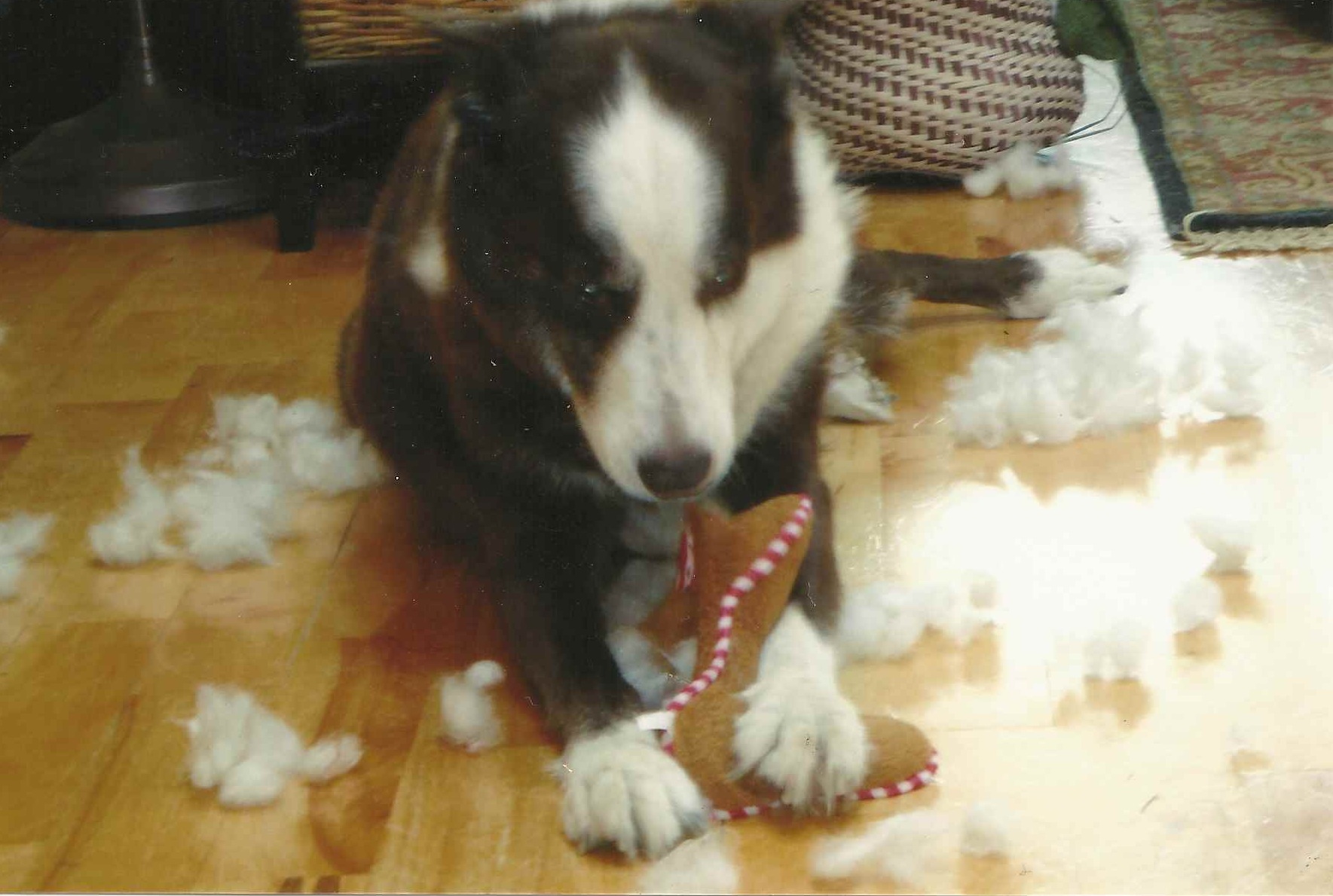 He also loved to work at stuffed dog toys, open them up and methodically remove the stuffing. One Christmas when #1 Sister was visiting, she carefully re-stuffed one and sewed it up for him to take apart again while he waited patiently. They both amused themselves with this activity for some time.
